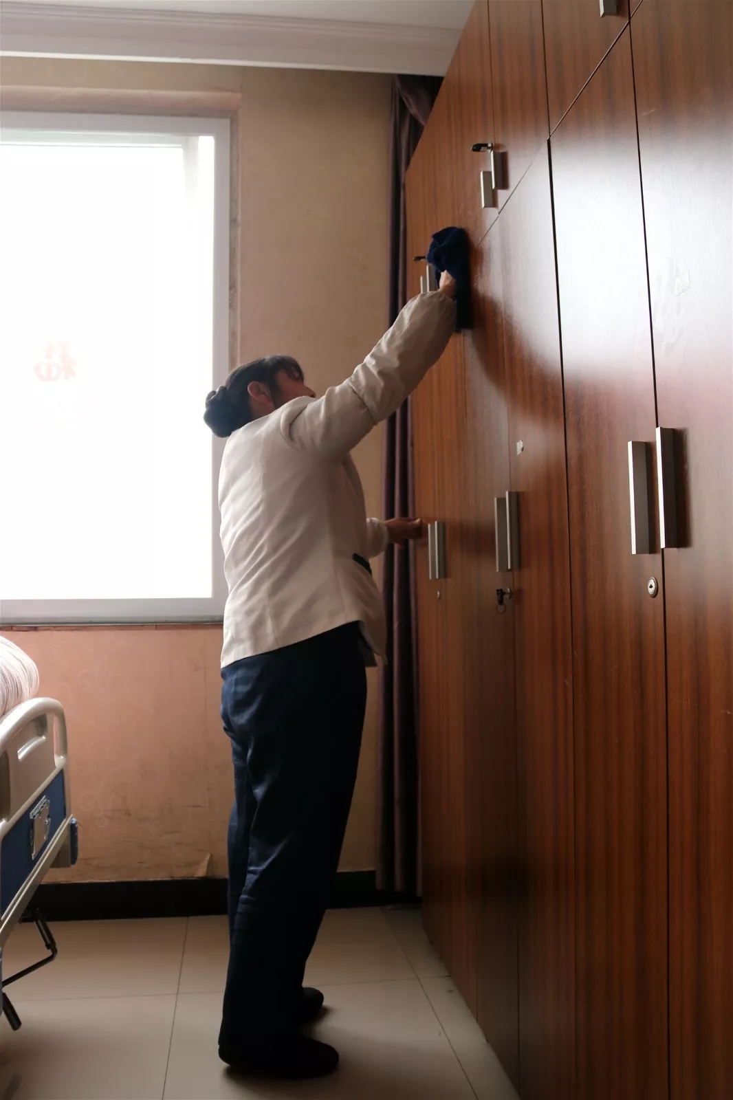 保潔人員逐個將老人們的房間玻璃、茶幾衣柜、地板走廊做了個深度清潔,忙的不亦樂乎,安靜的房間突然變得熱鬧起來!